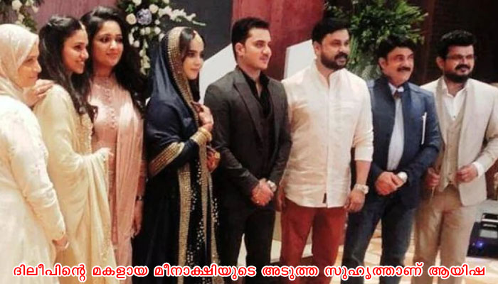 വ്യവസായിയായ ലത്തീഫ് ഉപ്ലയുടെ മകൻ ബിലാലും ആയുള്ള നാദിർഷയുടെ മകൾ ആയിഷയുടെ വിവാഹ ചിത്രങ്ങളാണ് ഇപ്പോൾ വൈറലായി കൊണ്ടിരിക്കുന്നത്. വിവാഹം കഴിഞ്ഞ് നാളുകൾക്ക് ശേഷമാണ് വിവാഹത്തിന്റെ ചിത്രങ്ങൾ പുറത്തുവന്നിരിക്കുന്നത്. ദിലീപിന്റെ മകളായ മീനാക്ഷിയുടെ അടുത്ത സുഹൃത്താണ് ആയിഷ. ഇവരുടെ സുഹൃത്താണ് നമിതപ്രമോദ്. ടിക്ക് ടോക്ക് വീഡിയോയുമായി ഇവർ ഒരുമിച്ച് എത്തിയിരുന്നു. സുഹൃത്ത് വിവാഹിതയാവുന്നതിന്റെ സന്തോഷവും ഇവർ പങ്കുവെച്ചിരുന്നു. കുടുംബസമേതം വിവാഹത്തിനെത്തിയ ദിലീപും കുടുംബവും നാദിർഷയുടെ കുടുംബത്തിനുമൊപ്പമുള്ള ചിത്രങ്ങളാണ് ഫാൻസ് പേജുകളിലും ഗ്രൂപ്പുകളിലുമെല്ലാം തരംഗമായി മാറി കൊണ്ടിരിക്കുന്നത്. വെളുത്ത മുണ്ടും ഷർട്ടും അണിഞ്ഞ് ആയിരുന്നു ദിലീപ് എത്തിയത്. വെളുത്ത കുർത്തിയിലായിരുന്നു നാദിർഷ. കുർത്തിയണിഞ്ഞ് അതീവ സുന്ദരിയായിട്ടാണ് മീനാക്ഷി എത്തിയത്. ഇത്തവണയും സൽവാറിൽ തന്നെയായിരുന്നു കാവ്യാമാധവൻ. കുടുംബസമേതം ഇവരുടെ ചിത്രങ്ങൾ കണ്ടതോടെ ആരാധകരും സ്നേഹം അറിയിച്ചു എത്തിയിട്ടുണ്ട്.