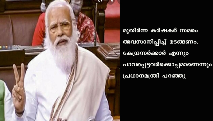 ന്യൂഡൽഹി: രാജ്യസഭയിൽ കർഷക സമരത്തെ വിമർശിച്ച് പ്രധാനമന്ത്രി നരേന്ദ്രമോദി. സമരം എന്തിന് വേണ്ടിയെന്ന് ആരും പറയുന്നില്ലെന്ന് പ്രധാനമന്ത്രി പറഞ്ഞു. കൃഷിമന്ത്രി ഉന്നയിച്ച ചോദ്യങ്ങൾക്ക് ആരും മറുപടി പറഞ്ഞില്ല. കാർഷിക നിയമത്തിൽ പോരായ്മകൾ ഉണ്ടെങ്കിൽ പരിഹരിക്കാം. മുതിർന്ന കർഷകർ സമരം അവസാനിപ്പിച്ച് മടങ്ങണം. കേന്ദ്രസർക്കാർ എന്നും പാവപ്പെട്ടവർക്കൊപ്പമാണെന്നും പ്രധാനമന്ത്രി പറഞ്ഞു.