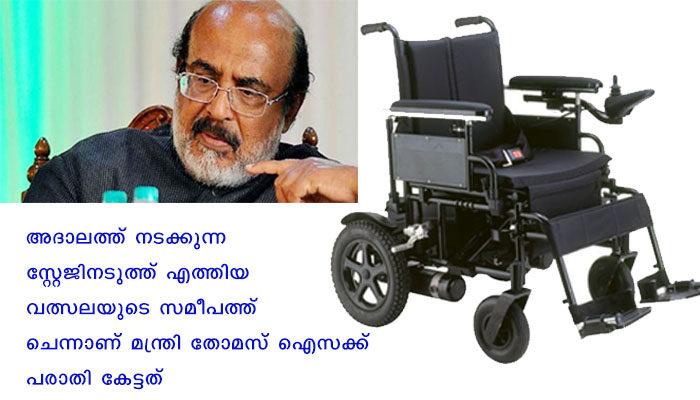 അദാലത്ത് നടക്കുന്ന സ്റ്റേജിനടുത്ത് എത്തിയ വത്സലയുടെ സമീപത്ത് ചെന്നാണ് മന്ത്രി തോമസ് ഐസക്ക് പരാതി കേട്ടത്. വികലാംഗ ക്ഷേമ കോര്പറേഷന് മുഖേനയാണ് ഇലക്ട്രിക് വീല്ചെയര് വത്സലക്ക് നല്കാനുള്ള നടപടിയെടുത്തത്.