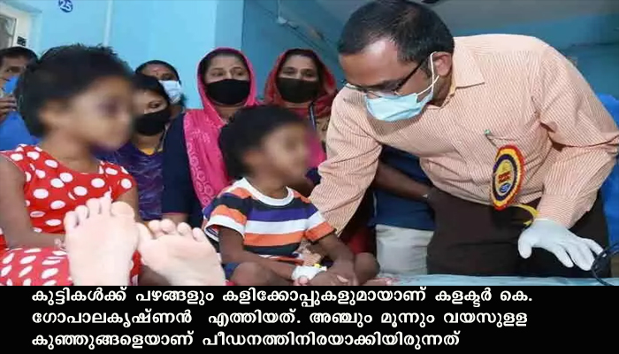 നിലമ്പൂര്: നിലമ്പൂര് മമ്പാട് അങ്ങാടിയില് പിതാവിന്റെയും രണ്ടാനമ്മയുടെയും മര്ദ്ദനത്തിനും പട്ടിണിക്കിടീലിനും ഇരയായി ജില്ലാ ആശുപത്രിയില് പ്രവേശിപ്പിച്ചിരുന്ന കുഞ്ഞുങ്ങളെ കാണാന് കളക്ടറെത്തി. കുട്ടികള്ക്ക് പഴങ്ങളും കളിക്കോപ്പുകളുമായാണ് കളക്ടര് കെ. ഗോപാലകൃഷ്ണന് എത്തിയത്. അഞ്ചും മൂന്നും വയസുളള കുഞ്ഞുങ്ങളെയാണ് പീഡനത്തിനിരയാക്കിയിരുന്നത്