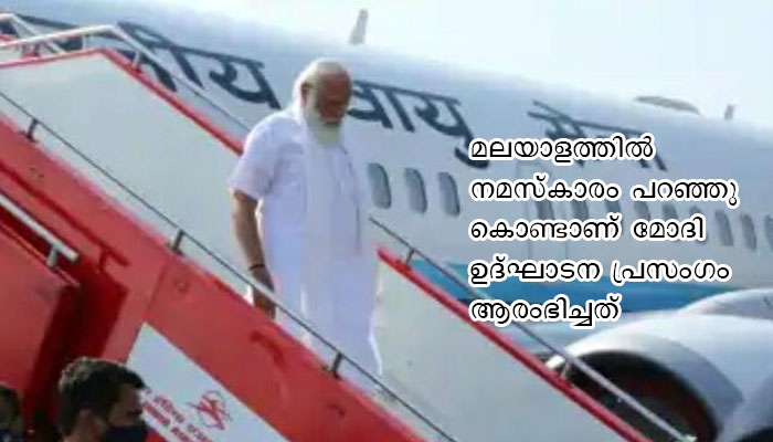 മലയാളത്തിൽ നമസ്കാരം പറഞ്ഞുകൊണ്ടാണ് മോദി ഉദ്ഘാടന പ്രസംഗം ആരംഭിച്ചത്. ടൂറിസം, വിദ്യാഭ്യാസം, തൊഴിൽ തുടങ്ങി വിവിധ മേഖലകൾക്ക് ഗുണകരമായ പദ്ധതികളാണ് ഇന്ന് ഉദ്ഘാടനം ചെയ്തത്. വലിയ തൊഴിലവസരം സൃഷ്ടിക്കപ്പെടുന്ന് പദ്ധതികളാണ് ഇതെന്നും പ്രധാനമന്ത്രി പറഞ്ഞു.