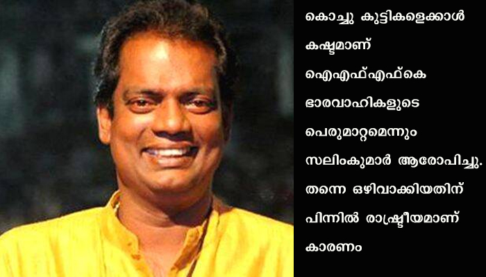 കൊച്ചു കുട്ടികളെക്കാൾ കഷ്ടമാണ് ഐഎഫ്എഫ്കെ ഭാരവാഹികളുടെ പെരുമാറ്റമെന്നും സലിംകുമാർ ആരോപിച്ചു. തന്നെ ഒഴിവാക്കിയതിന് പിന്നിൽ രാഷ്ട്രീയമാണ് കാരണം. സിപിഎം മേളയിൽ കോൺഗ്രസുകാരനെ പങ്കെടുപ്പിക്കില്ലെന്നും സലിംകുമാർ പറഞ്ഞു.