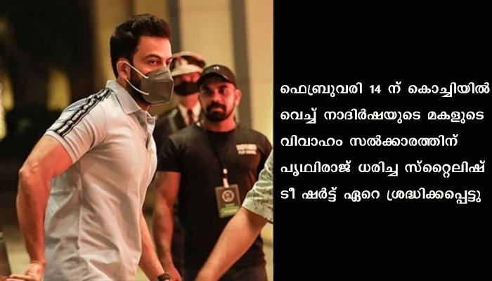 ഫെബ്രുവരി 14 ന് കൊച്ചിയിൽ വെച്ച് നാദിർഷയുടെ മകളുടെ വിവാഹം സൽക്കാരത്തിന് പൃഥ്വിരാജ് ധരിച്ച സ്റ്റൈലിഷ് ടീ ഷർട്ട് ഏറെ ശ്രദ്ധിക്കപ്പെട്ടു. അതോടെ ടീ ഷർട്ടിന്റെ പ്രത്യേകത അറിയാനുള്ള ആരാധകരുടെ ശ്രമത്തിനൊടുവിൽ അത് കണ്ടെത്തുകയും ചെയ്തു.