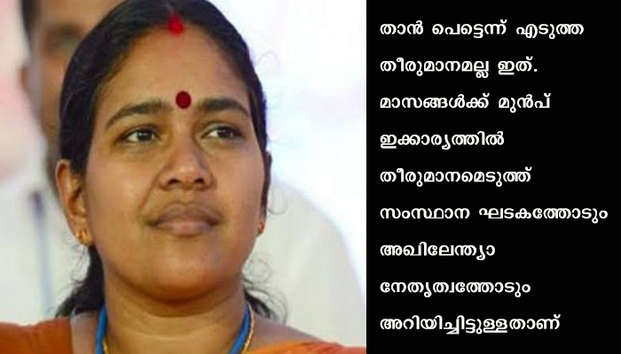 താൻ പെട്ടെന്ന് എടുത്ത തീരുമാനമല്ല ഇത്. മാസങ്ങള്ക്ക് മുന്പ് ഇക്കാര്യത്തില് തീരുമാനമെടുത്ത് സംസ്ഥാന ഘടകത്തോടും അഖിലേന്ത്യാ നേതൃത്വത്തോടും അറിയിച്ചിട്ടുള്ളതാണ്. എല്ലാ സമയത്തും ഒരു നേതാവ് തെരഞ്ഞെടുപ്പില് മത്സരിക്കണമെന്നില്ല. മറിച്ച് പാര്ട്ടിക്കുവേണ്ടി ചെയ്യാന് സാധിക്കുന്ന കാര്യങ്ങള് ചെയ്യുക എന്നുള്ളതാണ്. പുതിയ ഒരാള് മത്സര രംഗത്തേക്ക് വരട്ടെ. അസംബ്ലി തെരഞ്ഞെടുപ്പില് അഞ്ച് തവണ മത്സരിച്ചിട്ടുണ്ടെന്നും പറഞ്ഞു.