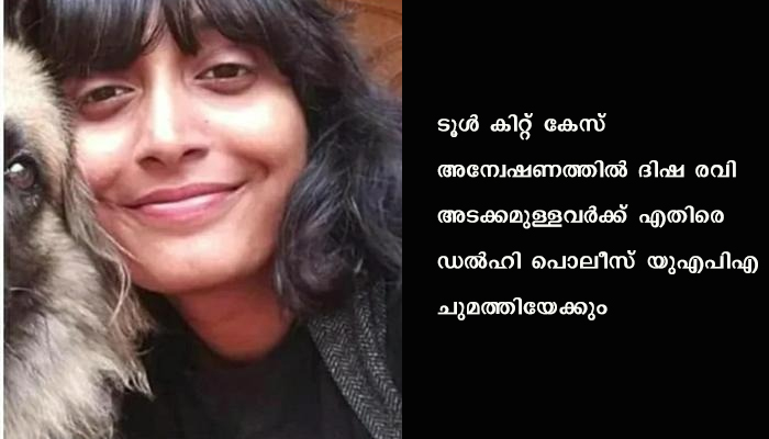 ന്യൂഡൽഹി: ടൂള് കിറ്റ് കേസ് അന്വേഷണത്തില് ദിഷ രവി അടക്കമുള്ളവര്ക്ക് എതിരെ ഡല്ഹി പൊലീസ് യുഎപിഎ ചുമത്തിയേക്കും. ടൂള് കിറ്റിലെ ഹൈപ്പര് ലിങ്കുകള് ദേശവിരുദ്ധ പ്രചാരണങ്ങളിലേക്കും സൈന്യം കൂട്ടക്കൊല നടത്തുന്നു എന്ന് വിധത്തില് നടത്തുന്ന പ്രചാരണങ്ങളിലേക്കും നയിക്കുന്നത് ചൂണ്ടിക്കാട്ടിയാകും യുഎപിഎ ചുമത്തുക.