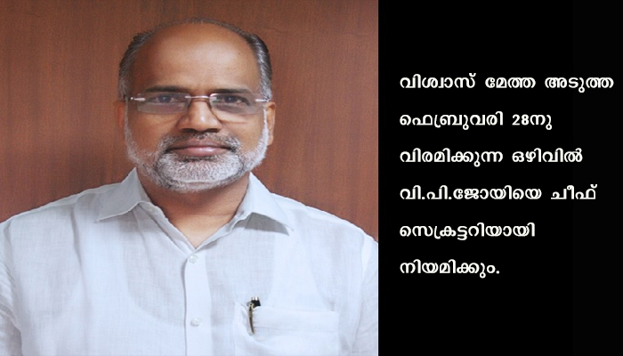 തിരുവനന്തപുരം: വിശ്വാസ് മേത്ത അടുത്ത ഫെബ്രുവരി 28നു വിരമിക്കുന്ന ഒഴിവില് വി.പി.ജോയിയെ ചീഫ് സെക്രട്ടറിയായി നിയമിക്കും. അദ്ദേഹത്തിന്റെ സേവനം വിട്ടുനല്കണമെന്നാവശ്യപ്പെട്ടു കേന്ദ്രത്തിനു നേരത്തെ സംസ്ഥാന സര്ക്കാര് കത്തെഴുതിയിരുന്നു.ജോയി ഇപ്പോള് കേന്ദ്ര കാബിനറ്റ് സെക്രട്ടേറിയറ്റില് സുരക്ഷ, ഏകോപനം എന്നിവയുടെ ചുമതലയുള്ള സെക്രട്ടറിയാണ്. നാഷനല് അതോറിറ്റി ഓണ് കെമിക്കല് വെപ്പണ്സ് കണ്വന്ഷന്റെ ചെയര്മാന് സ്ഥാനവും വഹിക്കുന്നു. കേന്ദ്രാനുമതി ലഭിച്ചാല് ജോയി കേരളത്തിലേക്കു മടങ്ങും. തുടര്ന്നു 2023 ജൂണ് 30 വരെ ചീഫ് സെക്രട്ടറി പദവിയില് തുടരും.വിഎസ്എസ്സിയില് ശാസ്ത്രജ്ഞനായിരിക്കെ 1987ലാണ് വി പി ജോയി സിവില് സര്വീസില് എത്തുന്നത്.പാലക്കാട്, പാല സബ് കലക്ടര്, പട്ടികജാതി വികസന, കൊളീജിയറ്റ് എഡ്യൂക്കേഷന് വകുപ്പുകളുടെ ഡയറക്ടര്, സഹകരണ സംഘം രജിസ്ട്രാര്, പൊതുവിദ്യാഭ്യാസ ഡയറക്ടറും സര്ക്കാര് പരീക്ഷകളുടെ കമീഷണറും, കൃഷി, മൃഗസംരക്ഷണ, ക്ഷീര, തൊഴില്, ഭവന, നികുതി വകുപ്പുകളുടെ സെക്രട്ടറി, വൈദ്യുതി ബോര്ഡ് ചെയര്മാന്, ധന വകുപ്പ് പ്രിന്സിപ്പല് സെക്രട്ടറി തുടങ്ങിയ ചുമതലകള് വഹിച്ചു.കേന്ദ്ര പെട്രോളിയവും പ്രകൃതിവാതകവും മന്ത്രാലയത്തില് ഡയറക്ടറായും ഊര്ജ മന്ത്രാലയത്തില് ജോയിന്റ് സെക്രട്ടറിയായും സെന്ട്രല് പ്രോവിഡന്റ് കമീഷണര്, ഇപിഎഫ്ഒ സിഇഒ, പെട്രോളിയം മന്ത്രാലയത്തില് ഡയറക്ടര് ജനറല് പദവികളും വഹിച്ചു.ഡല്ഹി ഐഐടിയില്നിന്ന് ഗവേഷണ ബിരുദവും ഹാര്വാഡ് യൂണിവേഴ്സിറ്റിയില്നിന്ന് പോസ്റ്റ് ഡോക്ടറല് റിസര്ച്ച് ഫെലോഷിപ്പും നേടി. രണ്ട് നോവല് ഉള്പ്പെടെ സാഹിത്യമേഖലയിലും വ്യക്തിമുദ്ര പതിപ്പിച്ചിട്ടുണ്ട്.