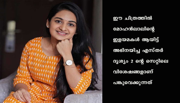 എസ്തർ ഒട്ടേറെ സിനിമകളിൽ ബാലതാരമായി അഭിനയിച്ചു എങ്കിലും ജിത്തു ജോസഫിന്റെ ദൃശ്യം 2 ലെ അനുമോൾ എന്ന കഥാപാത്രത്തെയാണ് പ്രേക്ഷകർ ഇരുകൈയും നീട്ടി സ്വീകരിച്ചത്. ഈ ചിത്രത്തിൽ മോഹൻലാലിന്റെ ഇളയമകൾ ആയിട്ട് അഭിനയിച്ച എസ്തർ ദൃശ്യം 2 ന്റെ സെറ്റിലെ വിശേഷങ്ങളാണ് പങ്കുവെക്കുന്നത്. പ്രത്യേകിച്ച് ഉച്ച അച്ഛൻറെ വേഷം ചെയ്ത ജോർജുകുട്ടി എന്ന മോഹൻലാലിനെ കുറിച്ച് .