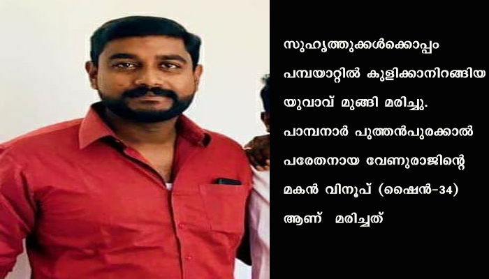 പീരുമേട്: സുഹൃത്തുക്കള്ക്കൊപ്പം പമ്പയാറ്റില് കുളിക്കാനിറങ്ങിയ യുവാവ് മുങ്ങി മരിച്ചു.പാമ്പനാര് പുത്തന്പുരക്കാല് പരേതനായ വേണുരാജിന്റെ മകന് വിനൂപ് (ഷൈന്-34) ആണ് മരിച്ചത്. തിരുവല്ലാ പുളിക്കീഴ് കീച്ചേരി വാന്കടവില് വൈകിട്ട് 5 മണിയോടെയാണ് അപകടം നടന്നത്. വിനൂപ് ഉള്പ്പടെ മൂന്നംഗ സംഘം ആണ് ഇവിടെ കുളിക്കാന് ഇറങ്ങിയത്.