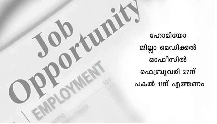 ആലപ്പുഴ: ജില്ല മെഡിക്കല് ഓഫീസിന്റെ (ഹോമിയോ) അധികാര പരിധിയിലുള്ള സ്ഥാപനങ്ങളില് ഫാര്മസിസ്റ്റ് തസ്തികകളില് ദിവസവേതനാടിസ്ഥാനത്തില് ഫാര്മസിസ്റ്റിനെ നിയമിക്കുന്നു. താല്പര്യമുള്ള എന്.സി.പി./ സി.സി.പി (ഹോമിയോ) കോഴ്സ് പാസായവര് യോഗ്യത, അര്ഹത സംബന്ധിച്ച അസ്സല് രേഖകള്, തിരിച്ചറിയല് രേഖ എന്നിവയുടെ പകര്പ്പ് സഹിതം ആലപ്പുഴ ഇരുമ്പ് പാലത്തിന് സമീപമുള്ള ഹോമിയോ ജില്ല മെഡിക്കല് ഓഫീസില് ഫെബ്രുവരി 27ന് പകല് 11ന് എത്തണം. ഓണ്ലൈന് കൂടിക്കാഴ്ചയില് പങ്കെടുക്കാന് താല്പര്യമുള്ളവര് സര്ട്ടിഫിക്കറ്റുകളുടെ പകര്പ്പ്, ഇ-മെയില് ഐ.ഡി., വാട്ട്സാപ്പ് നമ്പര് എന്നിവ ഫെബ്രുവരി 25ന് അഞ്ച് മണിക്ക് മുന്പായി dmohomoeoalp@kerala.gov.in എന്ന വിലാസത്തില് അപേക്ഷിക്കണം. പ്രായം 45 വയസ് കവിയരുത്. വിശദവിവരത്തിന് ഫോണ്: 0477 2262609.