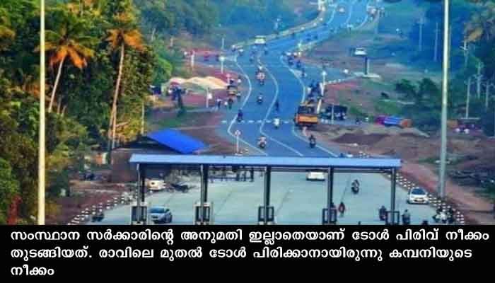സംസ്ഥാന സര്‍ക്കാരിന്റെ അനുമതി ഇല്ലാതെയാണ് ടോള്‍ പിരിവ് നീക്കം തുടങ്ങിയത്. രാവിലെ മുതല്‍ ടോള്‍ പിരിക്കാനായിരുന്നു കമ്പനിയുടെ നീക്കം. ഏതെങ്കിലും തരത്തിലുള്ള ഉത്തരവിന്റെ പകര്‍പ്പുമായി വന്നാലേ ടോള്‍ പിരിവ് ആരംഭിക്കാന്‍ സാധിക്കൂവെന്നും പോലീസ് വ്യക്തമാക്കി. 26/02/21 വെളളിയാഴ്ച എട്ട് മണി മുതലായിരുന്നു ടോള്‍ പിരിവ് ആരംഭിക്കേണ്ടിയിരുന്നത്.