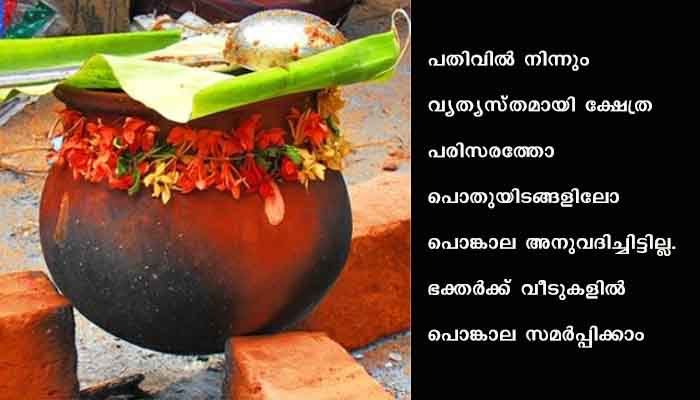 പതിവില് നിന്നും വ്യത്യസ്തമായി ക്ഷേത്ര പരിസരത്തോ പൊതുയിടങ്ങളിലോ പൊങ്കാല അനുവദിച്ചിട്ടില്ല. ഭക്തര്ക്ക് വീടുകളില് പൊങ്കാല സമര്പ്പിക്കാം. 3.40നാണ് പൊങ്കാല നിവേദ്യം. ആചാര പ്രധാനമായ കുത്തിയോട്ടം ഇത്തവണ പണ്ടാര ഓട്ടം മാത്രമായി പരിമിതപ്പെടുത്തിയിട്ടുണ്ട്.