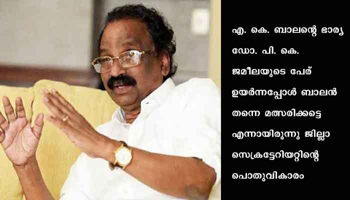 എ. കെ. ബാലന്റെ ഭാര്യ ഡോ. പി. കെ. ജമീലയെ സ്ഥാനാര്ത്ഥിയാക്കുന്നതിനെതിരെ പാലക്കാട് ജില്ലയിലെ പാര്ട്ടിക്കുള്ളില് അതൃപ്തി പുകയുന്നതിനിടെയാണ് ബാലന് ഇളവ് നല്കി മത്സരിപ്പിക്കണമെന്ന ആവശ്യം ജില്ലാ സെക്രട്ടേറിയറ്റ് മുന്നോട്ടു വയ്ക്കുന്നത്. 3/03/21 ബുധനാഴ്ച ചേര്ന്ന ജില്ലാ സെക്രട്ടേറിയറ്റ് യോഗത്തില് ഡോക്ടര് ജമീലയുടെ പേര് തരൂരിലേക്ക് ഉയര്ന്ന് വന്നപ്പോള് തന്നെ എതിര്പ്പുമുയര്ന്നിരുന്നു.