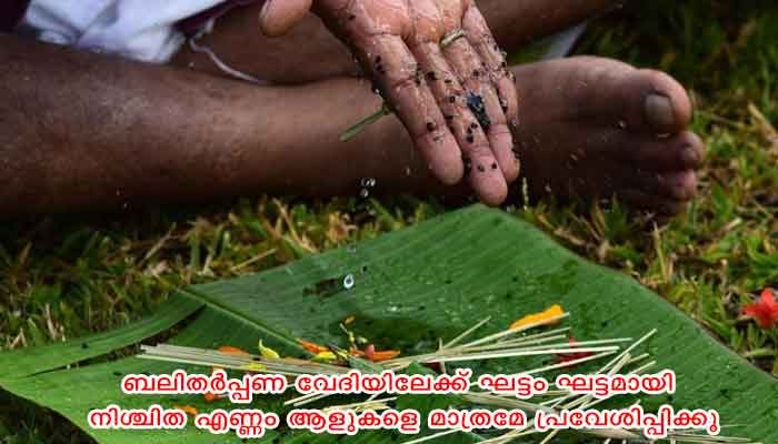 ക്ഷേത്രത്തില് പ്രവേശിക്കുന്നതിന് മുമ്പായി കൈകള് സാനിറ്റൈസ് ചെയ്യാനുള്ള സൗകര്യം ഏര്പ്പെടുത്തണം. ക്ഷേത്രത്തിനകത്തും ബലിതര്പ്പണ വേദിയിലും കുട്ടികളെയും 65 വയസിന് മുകളിലുള്ളവരെയും പങ്കെടുപ്പിക്കില്ല. ശരീരതാപനില പരിശോധിക്കുന്നതിനുള്ള സൗകര്യം ക്ഷേത്ര കവാടത്തിലും വാവുബലി നടത്താനുദ്ദേശിക്കുന്ന ഹാളിന് മുന്പിലും ഏര്പ്പെടുത്തണം. സാമൂഹിക അകലം പാലിക്കല്, മാസ്ക്ക് ധരിക്കല് എന്നിവ ഉറപ്പുവരുത്തണം.