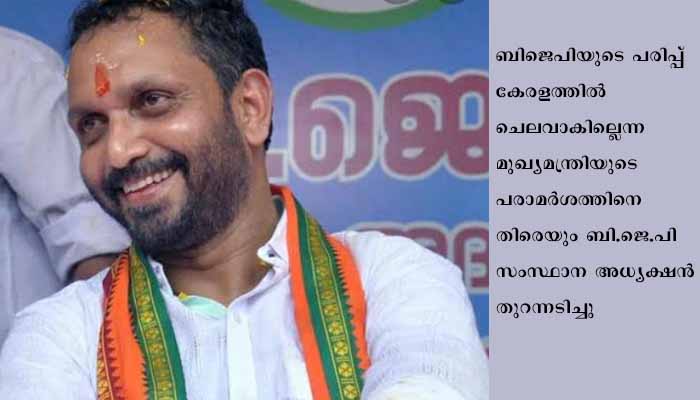 ബിജെപിയുടെ പരിപ്പ് കേരളത്തിൽ ചെലവാകില്ലെന്ന മുഖ്യമന്ത്രിയുടെ പരാമർശത്തിനെതിരെയും ബി.ജെ.പി സംസ്ഥാന അധ്യക്ഷൻ തുറന്നടിച്ചു. സിപിഎമ്മിന് വേരോട്ടമുള്ള സ്ഥലങ്ങളിലെല്ലാം ബിജെപി ജയിച്ചുവരികയാണ്. അതുപോലെ കേരളവും ബിജെപിക്ക് ബാലികേറാമലയല്ല. ബിജെപി കേരളത്തിൽ വളരുന്നതായി സിപിഎം സംസ്ഥാന സെക്രട്ടറിയേറ്റ് തന്നെ വിലയിരുത്തിയതാണ്. അതുകൊണ്ട് ബിജെപിയുടെ പരിപ്പ് ഇവിടെയും ചെലവാകുമെന്നും അദ്ദേഹം പറഞ്ഞു.