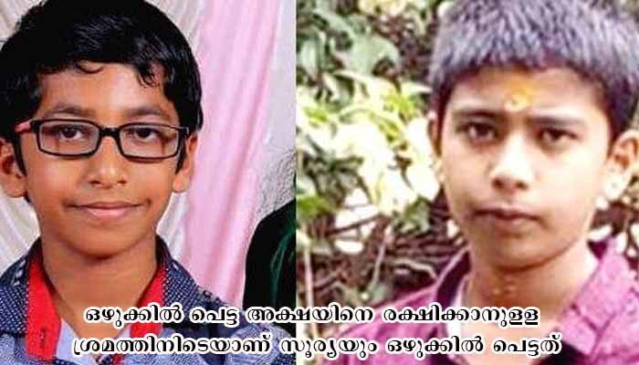 ഇന്നലെ വൈകിട്ട് നാലുമണിയോടെ വെളിയന്നൂരില് വില്ലുപാറ കടവിന് സമീപത്തെ കടവില് കുളിക്കാന് പോവുകയായിരുന്നു. അക്ഷയ് കൃഷ്ണയാണ് ആദ്യം കുളിക്കാനിറങ്ങിയത്. ഒഴുക്കില് പെട്ട അക്ഷയിനെ രക്ഷിക്കാനുളള ശ്രമത്തിനിടെയാണ് സൂര്യയും ഒഴുക്കില് പെട്ടത്.