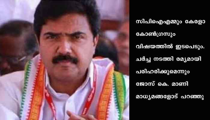 സിപിഐഎം നേതൃത്വമായി ചര്ച്ച ചെയ്ത് ഇക്കാര്യത്തില് പിന്നീട് തീരുമാനമെടുക്കും. രമ്യമായി പ്രശ്നം പരിഹരിക്കാനാകുമെന്ന് ആത്മവിശ്വാസമുണ്ട്. ഇക്കാര്യത്തില് ഇതുവരെ സിപിഐഎമ്മുമായി ഒരു ചര്ച്ചയും നടത്തിയിട്ടില്ല. സിപിഐഎമ്മും കേരളാ കോണ്ഗ്രസും വിഷയത്തില് ഇടപെടും. ചര്ച്ച നടത്തി രമ്യമായി പരിഹരിക്കുമെന്നും ജോസ് കെ. മാണി മാധ്യമങ്ങളോട് പറഞ്ഞു.