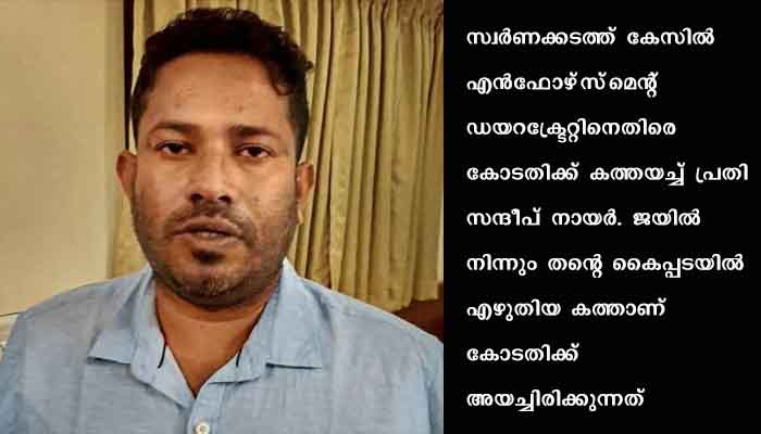 കൊച്ചി: സ്വര്ണക്കടത്ത് കേസില് എന്ഫോഴ്സ്മെന്റ് ഡയറക്ട്രേറ്റിനെതിരെ കോടതിക്ക് കത്തയച്ച് പ്രതി സന്ദീപ് നായര്. ജയില് നിന്നും തന്റെ കൈപ്പടയില് എഴുതിയ കത്താണ് കോടതിക്ക് അയച്ചിരിക്കുന്നത്. 12/03/21 വെളളിയാഴ്ചയാണ് കത്തിന്റെ പകർപ്പ് പുറത്തെത്തിയത്.
