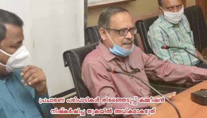 തിരഞ്ഞെടുപ്പിനായി നിഷ്കർഷിക്കുന്ന തുക മാത്രമേ പ്രചാരണത്തിനും അനുബന്ധകാര്യങ്ങള്ക്കുമായി ചെലവഴിക്കാൻ സ്ഥാനാര്ത്ഥികള്ക്ക് അനുമതിയുള്ളൂ. സ്ഥാനാര്ത്ഥികള്ക്ക് അനുവദിച്ചിട്ടുള്ള നിശ്ചിത തുകയ്ക്ക് മുകളിലുള്ള സാമ്പത്തിക ഇടപാടുകള് ചെക്ക് മുഖേന മാത്രമേ പാടുള്ളൂ. ഇതിനായി സ്ഥാനാര്ത്ഥികള് പ്രത്യേകം ബാങ്ക്അക്കൗണ്ട് തുടങ്ങണം. സ്ഥാനാര്ത്ഥികള് ചെലവഴിക്കുന്ന തുകയുടെ വൗച്ചറുകള് നിര്ബന്ധമായും സൂക്ഷിക്കുകയും വേണം. മറ്റ് വ്യക്തികളില് നിന്നും സ്ഥാപനങ്ങളില് നിന്നും സ്ഥാനാര്ത്ഥികള് സ്വീകരിക്കുന്ന പണത്തിന് ക്യാഷ് രജിസ്റ്റര് സൂക്ഷിക്കണം. പ്രചാരണ പരിപാടികള് തിരഞ്ഞെടുപ്പ് കമ്മീഷന് നിഷ്കര്ഷിച്ച തുകയില് അധികമാകരുത്. സാമൂഹിക മാധ്യമങ്ങളിലൂടെയുള്ള പ്രചാരണവും തിരഞ്ഞെടുപ്പ് ചെലവായി കണക്കാക്കും.
