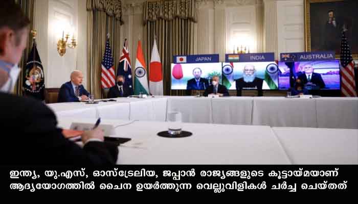 ഇന്ത്യ, യു.എസ്, ഓസ്ട്രേലിയ, ജപ്പാന് രാജ്യങ്ങളുടെ കൂട്ടായ്മയാണ് ആദ്യയോഗത്തില് ചൈന ഉയര്ത്തുന്ന വെല്ലുവിളികള് ചര്ച്ച ചെയ്തത്. തെക്കന്, കിഴക്കന് ചൈനാ കടലില് സഞ്ചാരസ്വാതന്ത്ര്യവും ചൈനീസ് സമ്മര്ദത്തില്നിന്നുള്ള മുക്തിയും ഉത്തരകൊറിയയുടെ ആണവവിഷയവും മ്യാന്മറിലെ അട്ടിമറിയും അതിക്രമവുമടക്കമുള്ള കാര്യങ്ങളും വെര്ച്വല് ഉച്ചകോടിയില് ചര്ച്ചയായി.