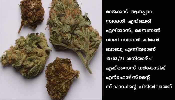 തമിഴ്നാട്ടില് നിന്ന് കൊണ്ടുവരുന്ന കഞ്ചാവ് ബൈകില് എത്തിച്ച് ആവശ്യക്കാര്ക്ക് പ്രതികള് കിലോയ്ക്ക് 35,000 രൂപയ്ക്കാണ് വില്പന നടത്തിയിരുന്നത്. എക്സൈസോ, പൊലീസോ പിന്തുടരുന്നതായി ശ്രദ്ധയില്പ്പെട്ടാല് ഇടവഴികളിലൂടെ അതിവേഗം ബൈകോടിച്ച് രക്ഷപ്പെടുന്നതായിരുന്നു പ്രതികളുടെ രീതി. ഇക്കാര്യം മനസിലാക്കിയ എക്സൈസ് സംഘം ഒരാഴ്ച പ്രതികളെ പിന്തുടര്ന്നു. തുടര്ന്ന് പുലര്ച്ചെ പ്രതികള് കഞ്ചാവ് വില്കാന് എത്തിയപ്പോള് പതിയിരുന്നു പിടികൂടുകയായിരുന്നു.