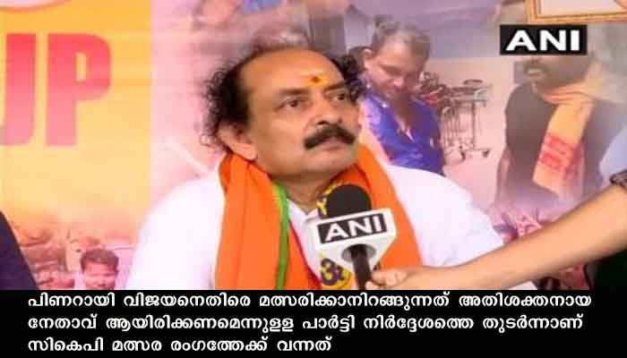 ശബരിമല സ്ത്രീ പ്രവേശനത്തിനെതിരെ ബിജെപി നടത്തിയ സമരത്തിന്റെ ഭാഗമായി സെക്രട്ടറിയേറ്റിന് മുന്നില് സികെപി 10 ദിവസം നിരാഹാരം കിടന്നത് ബിജെപി പ്രതിഷേധത്തിന് ശക്തി പകര്ന്നിരുന്നു. 70 പിന്നിട്ട സികെപി ശാരീരിക അവശതകളാല് ഇക്കുറി മത്സരിക്കുന്നില്ലെന്ന് അറിയിച്ചിരുന്നെങ്കിലും പാര്ട്ടി ആവശ്യപ്പെട്ടതനുസരിച്ച് കളത്തിലിറങ്ങാന് തയ്യാറാവുകയായിരുന്നു.