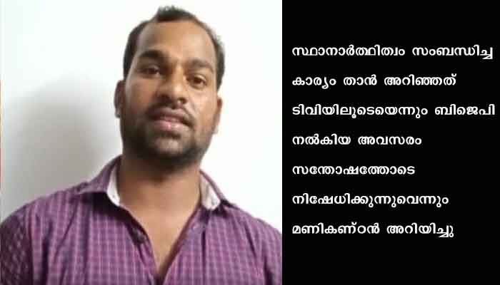 തന്റെ വിദ്യാഭ്യാസ യോഗ്യതയ്ക്കനിസരിച്ചുകൊണ്ടുള്ള ഒരു ജോലിയും ജീവിതവും മാത്രമാണ് ആഗ്രഹിച്ചതെന്നും തെരഞ്ഞെടുപ്പില് മത്സരിക്കണമെന്ന് താന് ചിന്തിച്ചിട്ടില്ലെന്നും മണികണ്ഠന് 15/03/21 തിങ്കളാഴ്ച പറഞ്ഞു. ഞായറാഴ്ചയാണ് വയനാട് ജില്ലയിലെ മാനന്തവാടി മണ്ഡലത്തിലെ ബിജെപി സ്ഥാനാര്ത്ഥിയായി ബിജെപി നേതൃത്വം സി മണികണ്ഠനെ പ്രഖ്യാപിച്ചത്.