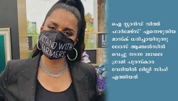 ന്യൂഡല്ഹി: ഗ്രാമി പുരസ്കാര വേദിയില് കര്ഷകര്ക്ക് ഐക്യദാര്ഢ്യവുമായി പ്രമുഖ യൂട്യൂബര് ലില്ലി സിംഗ്. ‘ ഐ സ്റ്റാന്ഡ് വിത്ത് ഫാര്മേഴ്സ്’ എന്നെഴുതിയ മാസ്ക് ധരിച്ചായിരുന്നു ലോസ് ആഞ്ചല്സില് വെച്ചു നടന്ന 2021ലെ ഗ്രാമി പുരസ്കാര വേദിയില് 14/03/21ഞായറാഴ്ച ലില്ലി സിംഗ് എത്തിയത്. കര്ഷകര്ക്കൊപ്പമെന്ന് പറഞ്ഞ് കറുത്ത സ്യൂട്ടും മാസ്കും ധരിച്ച് റെഡ് കാര്പ്പെറ്റില് നില്ക്കുന്ന ലില്ലിയുടെ ദൃശ്യങ്ങള് ഇതിനോടകം തന്നെ സമൂഹമാധ്യമങ്ങളില് വലിയ പ്രചാരമാണ് നേടിയിരിക്കുന്നത്.