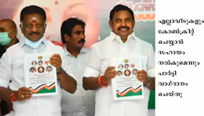 ചെന്നൈ: ഒരു വീട്ടില് ഒരു സര്ക്കാര് ജോലിക്കാരന്, എല്ലാവര്ക്കും വാഷിങ്മെഷീന്, സൗരോര്ജ അടുപ്പുകള്, സൗജന്യ കേബിള് ടിവി കണക്ഷന്, വിദ്യാര്ഥികള്ക്കു രണ്ട് ജിബി ഡേറ്റ തുടങ്ങിയ വാഗ്ദാന പെരുമഴയുമായി അണ്ണാ ഡി.എം.കെ പ്രകടന പത്രിക.അധികാരത്തിലെത്തിയാല് പൗരത്വ നിയമ ഭേദഗതി പിന്വലിക്കാനായി കേന്ദ്ര സര്ക്കാരില് സമ്മര്ദ്ദം ചെലുത്താമെന്നും വാഗ്ദാനമുണ്ട്.വിദ്യാഭ്യാസ ലോണുകള് എഴുതിത്തള്ളും,സ്ത്രീകള്ക്ക് സൗജന്യ ബസ് യാത്ര അനുവദിക്കും, ഇന്ധനവില കുറയ്ക്കാന് നടപടി സ്വീകരിക്കും, വിദ്യാഭ്യാസം സംസ്ഥാന ലിസ്റ്റിലേക്ക് മാറ്റും, വര്ഷത്തില് ആറ് സൗജന്യ ഗ്യാസ് സിലിണ്ടര് നല്കും തുടങ്ങിയ വാഗ്ദാനങ്ങളാണ് പ്രകടന പത്രികയിലുള്ളത്.