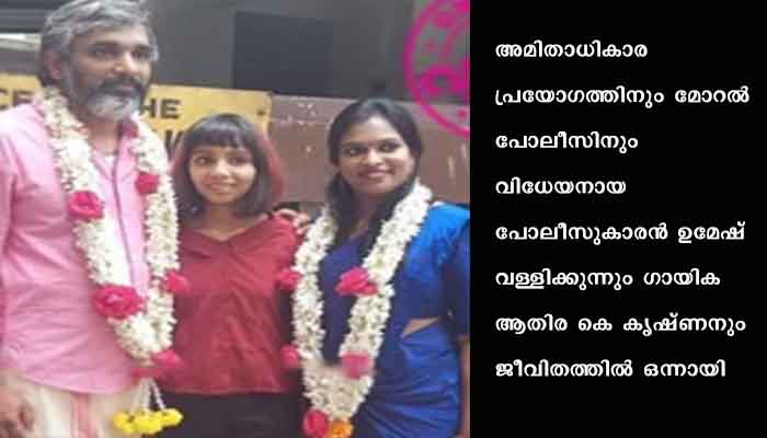 കോഴിക്കോട് : അമിതാധികാര പ്രയോഗത്തിനും മോറൽ പോലീസിനും വിധേയനായ പോലീസുകാരൻ ഉമേഷ് വള്ളിക്കുന്നും ഗായിക ആതിര കെ കൃഷ്ണനും ജീവിതത്തിൽ ഒന്നായി. 31 വയസ്സുള്ള ആതിരയുടെ അമ്മ നൽകിയ പരാതിയിൽ സദാചാര പോലീസിങ്ങിന് ഇരയാവുകയായിരുന്നു ഉമേഷും ആ തിരയും .
