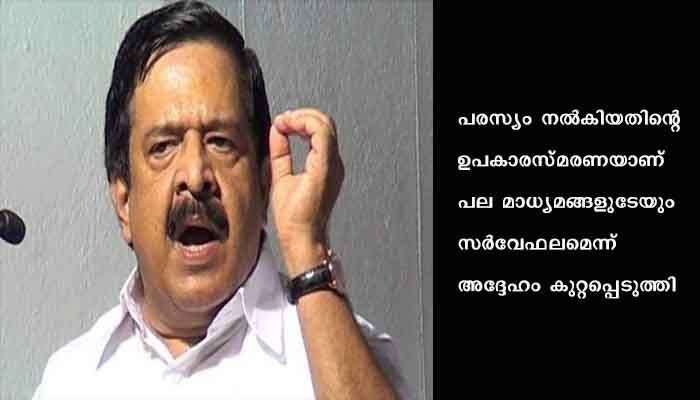 തിരുവനന്തപുരം: നിയമസഭാ തെരഞ്ഞെടുപ്പുമായി ബന്ധപ്പെട്ട് നടന്ന അഭിപ്രായ സർവേകൾക്കെതിരെ രൂക്ഷമായി പ്രതികരിച്ച് പ്രതിപക്ഷ നേതാവ് രമേശ് ചെന്നിത്തല. പരസ്യം നൽകിയതിന്റെ ഉപകാരസ്മരണയാണ് പല മാധ്യമങ്ങളുടേയും സർവേഫലമെന്ന് അദ്ദേഹം കുറ്റപ്പെടുത്തി.