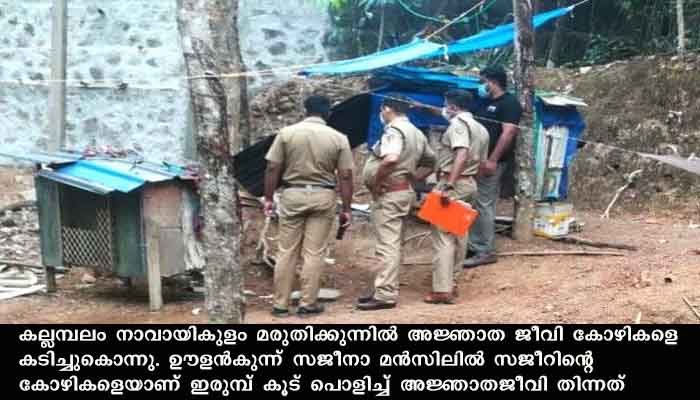 കല്ലമ്പലം: കല്ലമ്പലം നാവായികുളം മരുതിക്കുന്നില് അജ്ഞാത ജീവി കോഴികളെ കടിച്ചുകൊന്നു. ഊളന്കുന്ന് സജീനാ മന്സിലില് സജീറിന്റെ കോഴികളെയാണ് ഇരുമ്പ് കൂട് പൊളിച്ച് അജ്ഞാതജീവി തിന്നത്. 2021 മാര്ച്ച 19 വെളളിയാഴ്ച രാത്രിയിലായിരുന്നു സംഭവം. ശനിയാഴ്ച രാവിലെ പതിവുപോലെ കോഴികളെ തുറന്നുവിടാനെത്തിയപ്പോഴാണ് ഉടമ സംഭവം അറിയുന്നത്. പളളിക്കല് പോലീസെത്തി പരിശോധന നടത്തി. കൂടിന് സമീപത്ത് കണ്ട ജീവിയുടെ കാല്പ്പാടുകളുടെ ചിത്രം പരിശോധനക്കായി വനംവകുപ്പ് ഉദ്യോഗസ്ഥര്ക്ക് അയച്ചുകൊടുത്തു.