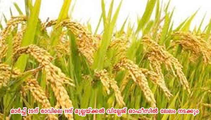 ആലപ്പുഴ: അമ്പലപ്പുഴ താലൂക്കിൽ മുല്ലയ്ക്കൽ വില്ലേജിൽ സർവേ നമ്പർ 835/1 എ1, 835/1 എ2, 835/1 എ4 എന്നിവയിൽപ്പെട്ട, ബോട്ട്-ഇൻ-ലാൻഡായി സർക്കാർ അധീനതയിലുള്ള 2.16.51 ഹെക്ടർ (5.35 ഏക്കർ) നിലത്ത് 2021-22 കാലയളവിലേക്ക് നെൽകൃഷി ചെയ്യുന്നതിനും വിളവെടുക്കുന്നതിനും അവകാശം ലേലം ചെയ്യുന്നു. മാർച്ച് 25ന് രാവിലെ 11ന് മുല്ലയ്ക്കൽ വില്ലേജ് ഓഫീസിൽ ലേലം നടക്കും. വിശദവിവരത്തിന് താലൂക്ക് ഓഫീസുമായി ബന്ധപ്പെടുക. ഫോൺ :0477-2253771.