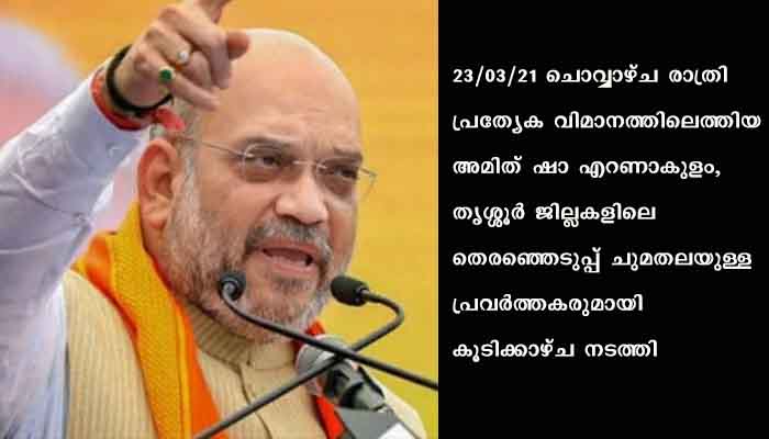 കൊച്ചി: നിയമസഭ തെരഞ്ഞെടുപ്പിന് മുന്നോടിയായി എന്.ഡി.എയുടെ പ്രചാരണ പരിപാടികളില് പങ്കെടുക്കാന് കേന്ദ്ര ആഭ്യന്തര മന്ത്രി അമിത്ഷാ കൊച്ചിയിലെത്തി. 23/03/21 ചൊവ്വാഴ്ച രാത്രി പ്രത്യേക വിമാനത്തിലെത്തിയ അമിത് ഷാ എറണാകുളം, തൃശ്ശൂര് ജില്ലകളിലെ തെരഞ്ഞെടുപ്പ് ചുമതലയുള്ള പ്രവര്ത്തകരുമായി കൂടിക്കാഴ്ച നടത്തി.