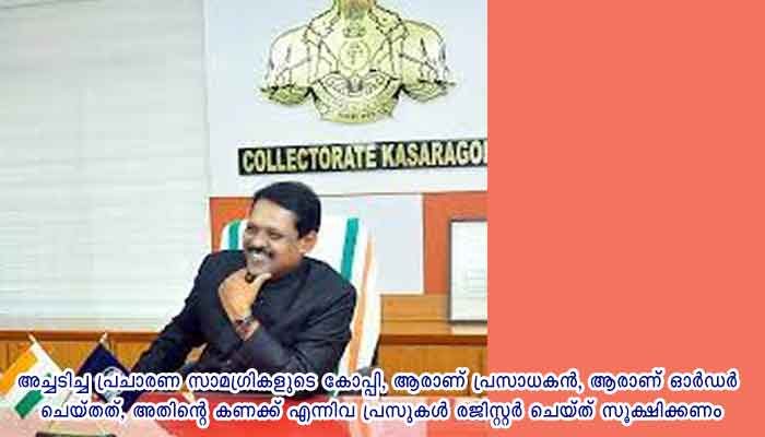 കാസർകോട്: നിയമസഭാ തെരഞ്ഞെടുപ്പുമായി ബന്ധപ്പെട്ട പോസ്റ്റര്, ലഘുലേഖ തുടങ്ങിയ പ്രചാരണ സാമഗ്രികളൊന്നും പ്രസിന്റെയും പ്രസാധകന്റെയും പേരും വിലാസവുമില്ലാതെ അച്ചടിക്കരുതെന്ന് ജില്ലാ തെരഞ്ഞെടുപ്പ് ഓഫീസറായ ജില്ലാ കളക്ടര് ഡോ. ഡി. സജിത് ബാബു അറിയിച്ചു.
