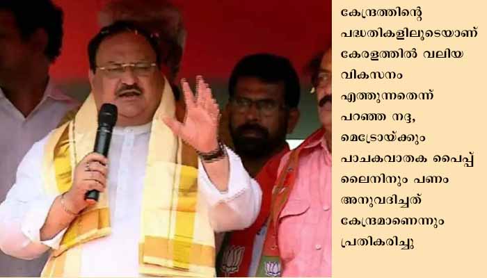 കേന്ദ്രത്തിന്റെ പദ്ധതികളിലൂടെയാണ് കേരളത്തിൽ വലിയ വികസനം എത്തുന്നതെന്ന് പറഞ്ഞ നദ്ദ, മെട്രോയ്ക്കും പാചകവാതക പൈപ്പ് ലൈനിനും പണം അനുവദിച്ചത് കേന്ദ്രമാണെന്നും പ്രതികരിച്ചു. പുറ്റിങ്ങൽ അപകടം ഉണ്ടായപ്പോൾ പ്രധാനമന്ത്രി നരേന്ദ്ര മോദി ഓടിയെത്തി. പക്ഷെ, മൻമോഹൻ സിംഗിന്റെ കാലത്ത് കേരളത്തെ തിരിഞ്ഞു നോക്കിയില്ലെന്നും നദ്ദ കുറ്റപ്പെടുത്തി.