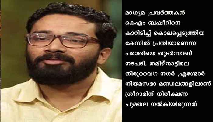 ചെന്നൈ: തമിഴ്‌നാട്ടില്‍ തെരഞ്ഞെടുപ്പ് നിരീക്ഷകനായി നിയോഗിക്കപ്പെട്ട ഐഎഎസ് ഉദ്യോഗസ്ഥന്‍ ശ്രീരാം വെങ്കിട്ടരാമനെ തെരഞ്ഞെടുപ്പ് കമ്മീഷന്‍ തിരികെ വിളിച്ചു. മാധ്യമ പ്രവര്‍ത്തകന്‍ കെഎം ബഷീറിനെ കാറിടിച്ച് കൊലപ്പെടുത്തിയ കേസില്‍ പ്രതിയാണെന്ന പരാതിയെ തുടര്‍ന്നാണ് നടപടി. തമിഴ്‌നാട്ടിലെ തിരുവൈഗ നഗര്‍ ,എഗ്മോര്‍ നിയമ സഭാ മണ്ഡലങ്ങളിലാണ് ശ്രീറാമിന് നിരീക്ഷണ ചുമതല നല്‍കിയിരുന്നത്.