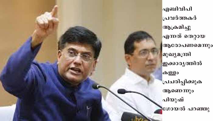 എബിവിപി പ്രവർത്തകർ ആക്രമിച്ചു എന്നത് തെറ്റായ ആരോപണമെന്നും മുഖ്യമന്ത്രി ഇക്കാര്യത്തിൽ കള്ളം പ്രചരിപ്പിക്കുകയാണെന്നും പിയുഷ് ഗോയല് പറഞ്ഞു.