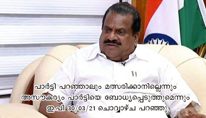 പാര്ട്ടി പറഞ്ഞാലും മത്സരിക്കാനില്ലെന്നും അസൗകര്യം പാര്ട്ടിയെ ബോധ്യപ്പെടുത്തുമെന്നും ഇ.പി 30/03/21 ചൊവ്വാഴ്ച പറഞ്ഞു.