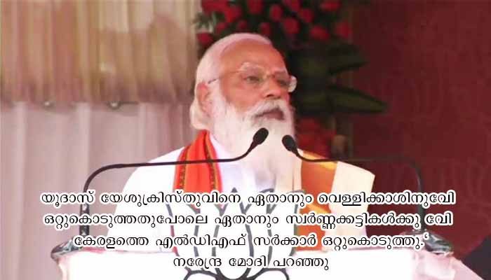 “എല്ഡിഎഫും യുഡിഎഫും മാറിമാറി വന്ന് കൊള്ളയടിക്കുന്ന കാഴ്ചയാണ് കേരളത്തില് കാണാനാകുന്നത്. അഞ്ച് വര്ഷം ഒരു കൂട്ടര് കൊള്ളയടിക്കുന്നു. പിന്നീടുള്ള അഞ്ച് വര്ഷം അടുത്ത കൂട്ടര് വരുന്നു. ഇന്ത്യയില് പലയിടത്തും കോണ്ഗ്രസും ഇടതുപാര്ട്ടികളുമായി ഈ ശത്രുത ഇല്ല. കേന്ദ്രത്തില് യുപിഎ സര്ക്കാരിനെ മുന്പ് ഇടതുപാര്ട്ടികള് പിന്തുണച്ചിരുന്നു. അണിയറയ്ക്ക് പിന്നില് നടക്കുന്ന നാടകങ്ങള് ഇപ്പോള് തുറന്നുകാട്ടപ്പെടുകയാണ്. പശ്ചിമബംഗാളില് ഇരുപാര്ട്ടികളും ചങ്ങാത്തത്തിലാണ്. വ്യത്യസ്ത പേരുകള് ആണെങ്കിലും രണ്ട് കൂട്ടരും ചെയ്യുന്നത് ഒരേ പ്രവൃത്തികള് തന്നെയാണ്. യുഡിഎഫുകാര് സൂര്യരശ്മികളെപ്പോലും വിറുതെവിട്ടില്ല. യൂദാസ് യേശുക്രിസ്തുവിനെ ഏതാനും വെള്ളിക്കാശിനുവേണ്ടി ഒറ്റുകൊടുത്തതുപോലെ ഏതാനും സ്വര്ണ്ണക്കട്ടികള്ക്കു വേണ്ടി കേരളത്തെ എല്ഡിഎഫ് സര്ക്കാര് ഒറ്റുകൊടുത്തു.”