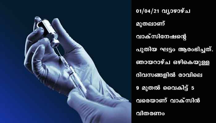 ഞായറാഴ്ച ഒഴികെയുള്ള ദിവസങ്ങളിൽ രാവിലെ 9 മുതൽ വൈകിട്ട് 5 വരെയാണ് വാക്സിൻ വിതരണം. രജിസ്ട്രേഷൻ ഘട്ടത്തിൽതന്നെ ഇഷ്ടമുള്ള ആശുപത്രിയും ദിവസവും തിരഞ്ഞെടുക്കാം. രജിസ്റ്റർ ചെയ്യാതെ അതെ നേരിട്ട് എത്തിയും മരുന്ന് സ്വീകരിക്കാം. 45 വയസ്സിന് മുകളിൽ ഉള്ളവർക്ക് 45 ദിവസം കൊണ്ട് മരുന്ന് വിതരണം പൂർത്തിയാക്കുകയാണ് ലക്ഷ്യം.