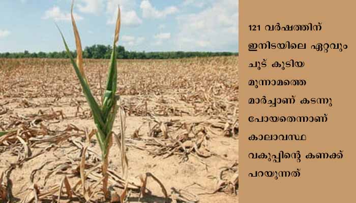 ശരാശരി ഉയര്ന്ന താപനില പരിശോധിക്കുമ്പോൾ, ഇക്കഴിഞ്ഞ മാര്ച്ചില് അനുഭവപ്പെട്ടത് അതിതീവ്രമായ ചൂട്. 121 വര്ഷത്തിനിടയിലെ ഏറ്റവും ചൂട് കൂടിയ മൂന്നാമത്തെ മാര്ച്ചാണ് കടന്നുപോയതെന്നാണ് കാലാവസ്ഥ വകുപ്പിന്റെ കണക്ക് പറയുന്നത്. 32.65 ആണ് ഉയര്ന്ന ശരാശരി താപനില. കുറഞ്ഞ ശരാശരി താപനില 19.95ഉം. രാജ്യത്തിന്റെ വിവിധ ഭാഗങ്ങളില് മാര്ച്ചില് 40 ഡിഗ്രിയില് മുകളിലായിരുന്നു ചൂട്.