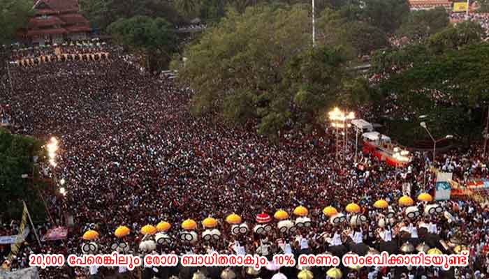 തെരഞ്ഞെടുപ്പിന് പിന്നാലെ കൊവിഡ് വ്യാപനം രൂക്ഷമായ സാഹചര്യത്തില്‍ കൂടുതല്‍ ആളുകളെ പങ്കെടുപ്പിച്ച് തൃശൂര്‍ പൂരം നടത്തുന്നത് സംബന്ധിച്ച് സംസ്ഥാന സര്‍ക്കാര്‍ പുനര്‍വിചിന്തനം നടത്തണമെന്ന് ആരോഗ്യ വകുപ്പ് ആവശ്യപ്പെട്ടിരുന്നു. പൂരത്തിനെത്തുന്ന ആളുകളെ നിയന്ത്രിച്ചില്ലെങ്കില്‍ വലിയ വിപത്താകും സംഭവിക്കുകയെന്ന് തൃശൂര്‍ ഡി.എം.ഒ പറഞ്ഞിരുന്നു. അപകടകരമായ അവസ്ഥയിലേക്ക് സ്ഥിതിയെത്തിയേക്കും. 20,000 പേരെങ്കിലും രോഗ ബാധിതരാകും. 10% മരണം സംഭവിക്കാനിടയുണ്ട്. കഴിഞ്ഞ ഒന്നരവര്‍ഷമായി ആരോഗ്യവകുപ്പ് നടത്തിയ എല്ലാ കൊവിഡ് പ്രതിരോധപ്രവര്‍ത്തനങ്ങളും പാഴായിപോകും. ഇക്കാര്യം ചൂണ്ടിക്കാട്ടി സര്‍ക്കാരിന് റിപ്പോര്‍ട്ട് നല്‍കിയെന്ന് വ്യക്തമാക്കിയ ഡി.എം.ഒ ഇനി എന്തു സംഭവിച്ചാലും ആരോഗ്യ വകുപ്പിന് ഉത്തരവാദിത്തമില്ലെന്നും പ്രതികരിച്ചു.