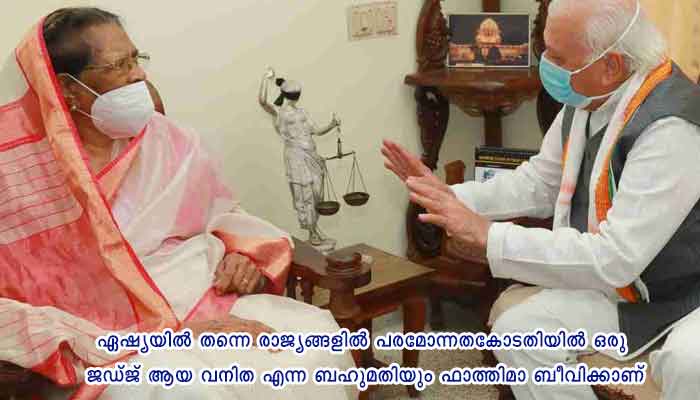 വളരെ കാലമായി ഗവര്‍ണറെ നേരിട്ട് അറിയാമെന്ന് ജസ്റ്റിസ്. എം. ഫാത്തിമ ബീവി പറഞ്ഞു. അദ്ദേഹത്തിന്റെ സഹോദരനുമായും അടുത്ത ബന്ധമുണ്ട്. തീര്‍ത്തും സൗഹൃദ സന്ദര്‍ശനമായിരുന്നു ഗവര്‍ണര്‍ നടത്തിയത്. ആരോഗ്യം ശ്രദ്ധിക്കണമെന്ന് ഗവര്‍ണര്‍ പറഞ്ഞെന്നും ജസ്റ്റിസ് ഫാത്തിമാ ബീവി പറഞ്ഞു. സുപ്രീം കോടതിയിലെ ആദ്യ വനിതാ ജഡ്ജി എന്നതും, ഇന്ത്യയുടെ ന്യായാധിപ സ്ഥാനങ്ങളില്‍ ഏറ്റവും ഉന്നത സ്ഥാനത്ത് ഇരുന്ന ആദ്യത്തെ മുസ്ലീം വനിത എന്ന ബഹുമതിയും ജസ്റ്റിസ് ഫാത്തിമ ബീവിക്ക് സ്വന്തമാണ്. ഏഷ്യയില്‍ തന്നെ രാജ്യങ്ങളില്‍ പരമോന്നതകോടതിയില്‍ ഒരു ജഡ്ജ് ആയ വനിത എന്ന ബഹുമതിയും ഫാത്തിമാ ബീവിക്കാണ്. സുപ്രീം കോടതിയിലെ പദവിയില്‍ നിന്ന് വിരമിച്ച ശേഷം ജസ്റ്റിസ് ഫാത്തിമ ബീവി തമിഴ്‌നാട് ഗവര്‍ണറായും സേവനമനുഷ്ഠിച്ചിട്ടുണ്ട്.