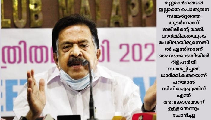 ടെ പേരിലായിരുന്നെങ്കില് മാര്ക്ക് ദാന വിവാദം വന്നപ്പോള് രാജി വയ്ക്കേണ്ടതായിരുന്നു. എന്നാല് അന്ന് അദ്ദേഹത്തെ മുഖ്യമന്ത്രി സംരക്ഷിച്ചുവെന്നും ചെന്നിത്തല കുറ്റപ്പെടുത്തി.