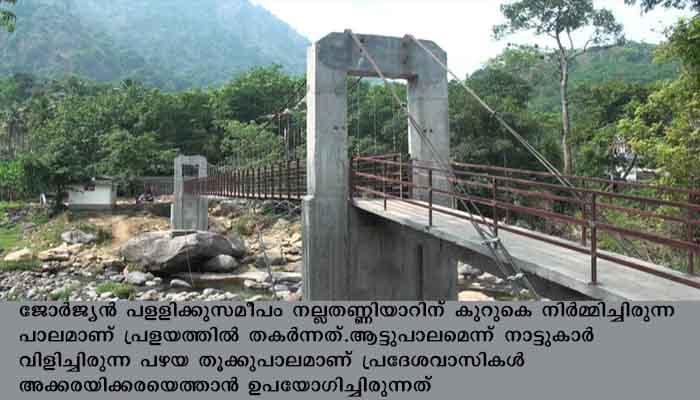 അടിമാലി : പ്രളയം തകര്ത്ത മാങ്കുളം ആറാം മൈലിലെ തൂക്കുപാലം പുനര് നിര്മ്മിച്ചു. ജോര്ജ്യന് പളളിക്കുസമീപം നല്ലതണ്ണിയാറിന് കുറുകെ നിര്മ്മിച്ചിരുന്ന പാലമാണ് പ്രളയത്തില് തകര്ന്നത്. ആട്ടുപാലമെന്ന് നാട്ടുകാര് വിളിച്ചിരുന്ന പഴയ തൂക്കുപാലമാണ് പ്രദേശവാസികള് അക്കരയിക്കരയെത്താന് ഉപയോഗിച്ചിരുന്നത്.