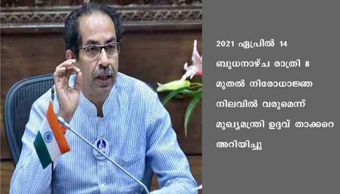 മുംബൈ: മഹാരാഷ്ട്രയില്‍ 15 ദിവസത്തെ നിരോധനാജ്ഞ പ്രഖ്യാപിച്ചു. കോവിഡ് വ്യാപപകമായ സാഹചരത്തിലാണ് നിരോധനാജ്ഞ പ്രഖ്യാപിച്ചത്. 2021 ഏപ്രില്‍ 14 ബുധനാഴ്ച രാത്രി 8 മുതല്‍ നിരോധാജ്ഞ നിലവില്‍ വരുമെന്ന് മുഖ്യമന്ത്രി ഉദ്ദവ് താക്കറെ അറിയിച്ചു. മെയ് 1 വരെയാണ് നിരോധനാജ്ഞ. ലോക് ഡൗണിന് സമാനമായ നിയന്ത്രണങ്ങള്‍ ഉണ്ടാവും. രാവിലെ 7 മുതല്‍ രാത്രി 7 വരെ അവശ്യ സര്‍വീസുകള്‍ മാത്രമേ അനുവദിക്കൂ. കോവിഡ് രോഗികള്‍ അപകടമായ രീതിയിൽ വര്‍ദ്ധിക്കുകയാമെന്നും ‘യുദ്ധം’ വീണ്ടും തുടങ്ങുകയാണെന്നും മുഖ്യമന്ത്രി പറഞ്ഞു. സംസ്ഥാനം മുഴുവന്‍ 144 വ്യാപിപ്പിക്കും.