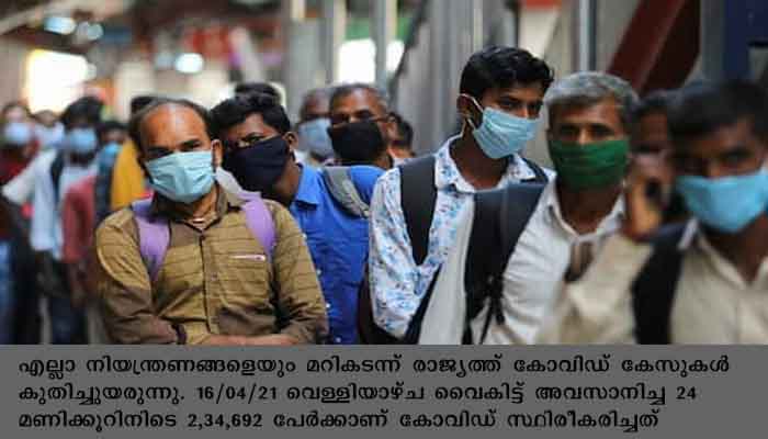 ന്യൂഡൽഹി: എല്ലാ നിയന്ത്രണങ്ങളെയും മറികടന്ന് രാജ്യത്ത് കോവിഡ് കേസുകൾ കുതിച്ചുയരുന്നു. 16/04/21 വെള്ളിയാഴ്ച വൈകിട്ട് അവസാനിച്ച 24 മണിക്കൂറിനിടെ 2,34,692 പേർക്കാണ് കോവിഡ് സ്ഥിരീകരിച്ചത്. തുടർച്ചയായി മൂന്നാം ദിവസമാണ് രാജ്യത്ത് കോവിഡ് രോഗികളുടെ എണ്ണം രണ്ട് ലക്ഷം പിന്നിടുന്നത്.