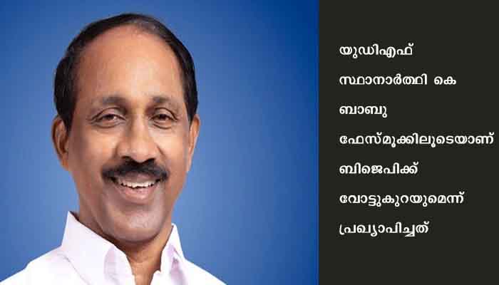 ബുക്കിലൂടെയാണ് ബിജെപിക്ക് വോട്ടുകുറയുമെന്ന് പ്രഖ്യാപിച്ചത്. തൃപ്പൂണിത്തുറയില് ബിജെപിക്ക് വോട്ടുലഭിക്കാനുളള പ്രാദേശിക ഇടപെടല് യുഡിഎഫ് ഭാഗത്തുനിന്ന് ഉണ്ടായിയെന്ന സിപിഎം സംസ്ഥാന കമ്മറ്റി വിലയിരുത്തല് തോല്വി സമ്മതിക്കലാണെന്ന് ബാബു കുറിച്ചു. തുടക്കം മുതല് യുഡിഎഫ് ബിജെപി ബന്ധം ആരോപിച്ചത് ന്യൂനപക്ഷ വോട്ടുകളെ സ്വാധീനിക്കാനുളള സിപിഎം ന്റെ കുടില തന്ത്രമായിരുന്നുവെന്നും ബാബു ഫെയ്സ്ബുക്കില് കുറിച്ചു.