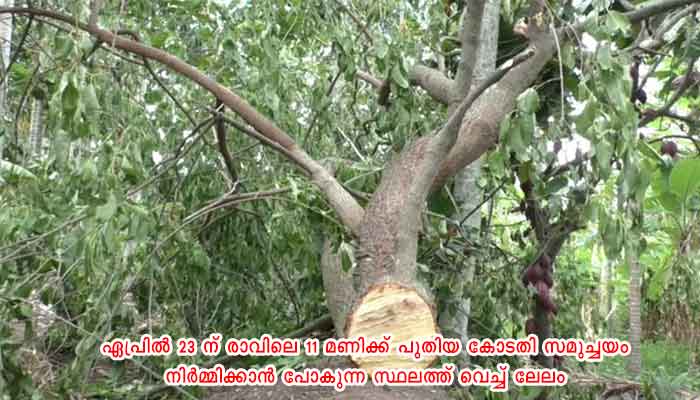 തൃശ്ശൂർ: ചാലക്കുടി കോടതി സമുച്ചയ നിര്മ്മാണത്തിന് തടസമായി നില്ക്കുന്ന മരങ്ങള് പരസ്യമായി ലേലം ചെയ്ത് വില്ക്കുന്നു. അസിസ്റ്റന്റ് എഞ്ചിനീയറോ അദ്ദേഹം ചുമതലപ്പെടുത്തുന്ന ഉദ്യോഗസ്ഥരോ ഏപ്രില് 23 ന് രാവിലെ 11 മണിക്ക് പുതിയ കോടതി സമുച്ചയം നിര്മ്മിക്കാന് പോകുന്ന സ്ഥലത്ത് വെച്ച് ലേലം ചെയ്യുമെന്ന് അസി എഞ്ചിനീയര് അറിയിച്ചു. കൂടുതല് വിവരങ്ങള് ഓഫീസില് നിന്ന് ലഭിക്കും.