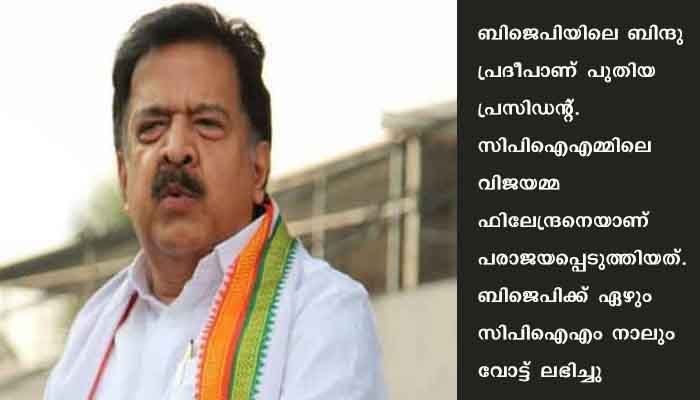 20/04/21 ചൊവ്വാഴ്ച നടന്ന പ്രസിഡന്റ് തെരഞ്ഞെടുപ്പില് നിന്നും കോണ്ഗ്രസ് വിട്ടുനില്ക്കുകയായിരുന്നു. ബിജെപിയിലെ ബിന്ദു പ്രദീപാണ് പുതിയ പ്രസിഡന്റ്. സിപിഐഎമ്മിലെ വിജയമ്മ ഫിലേന്ദ്രനെയാണ് പരാജയപ്പെടുത്തിയത്. ബിജെപിക്ക് ഏഴും സിപിഐഎം നാലും വോട്ട് ലഭിച്ചു.